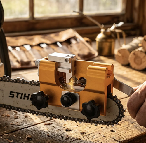 Klampero is een draagbaar, handmatig slijpapparaat voor kettingzagen. Het maakt het mogelijk om de zaagketting ter plekke nauwkeurig te slijpen β zonder stroom, zonder bezoek aan de werkplaats, in enkele minuten.