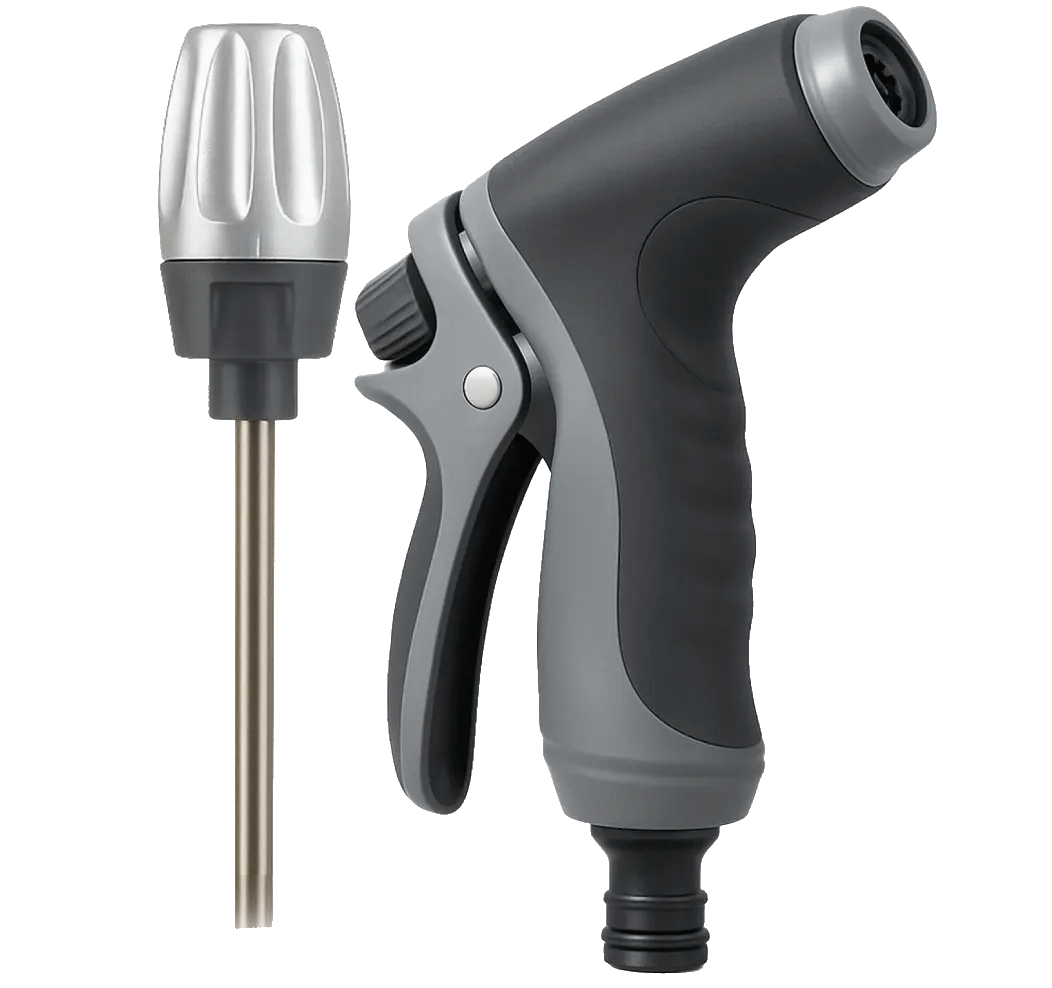 - De sproeikop is verstelbaar en schakelt tussen een brede waaierstraal en een gerichte hogedrukstraal.